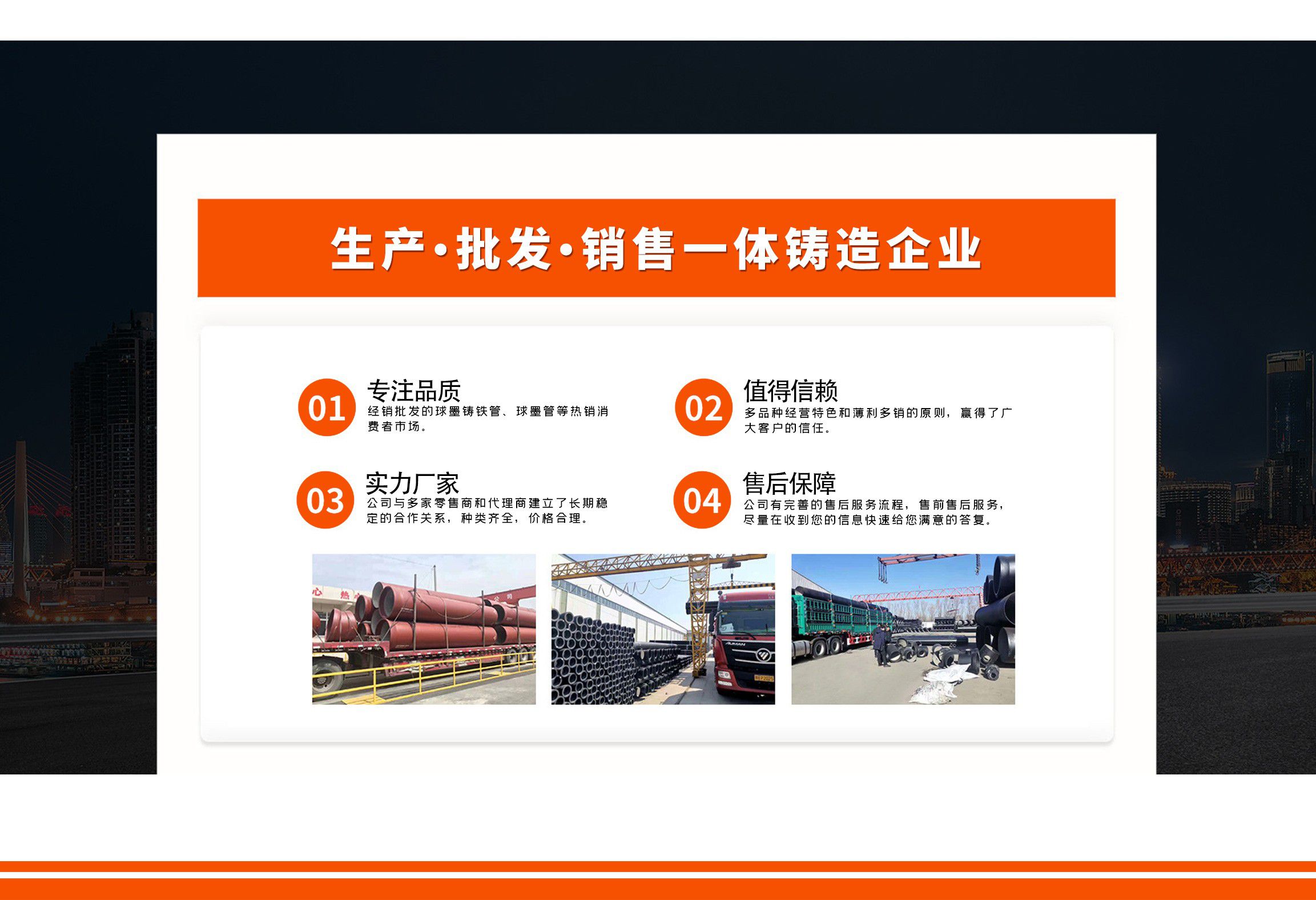 青島金源達(dá)管業(yè)有限公司主要經(jīng)營各種規(guī)格球墨鑄鐵管,球墨管,球墨鑄鐵管廠家等產(chǎn)品,質(zhì)量可靠,誠信經(jīng)營,值得信賴! 青島金源達(dá)管業(yè)有限公司始終堅持“誠信立業(yè),追求卓越,合作共贏,共同發(fā)展”,竭誠歡迎各界朋友來廠參觀指導(dǎo),洽談業(yè)務(wù)。我們愿與您攜手共進,互惠雙贏,共創(chuàng)未來! 公司堅持“以奮斗者為本”的理念,關(guān)心關(guān)愛職工,職工的獲得感、幸福感更加充實、更有保障、更可持續(xù);秉承“忠誠企業(yè)、勇于擔(dān)當(dāng)、開拓創(chuàng)新、主動作為”,堅持黨建領(lǐng)航、創(chuàng)新驅(qū)動、文化塑魂、奉獻(xiàn)社會,全面致力于綠色、低碳、高效、高質(zhì)量發(fā)展。 愿與各界朋友攜手并進,共創(chuàng)未來!...